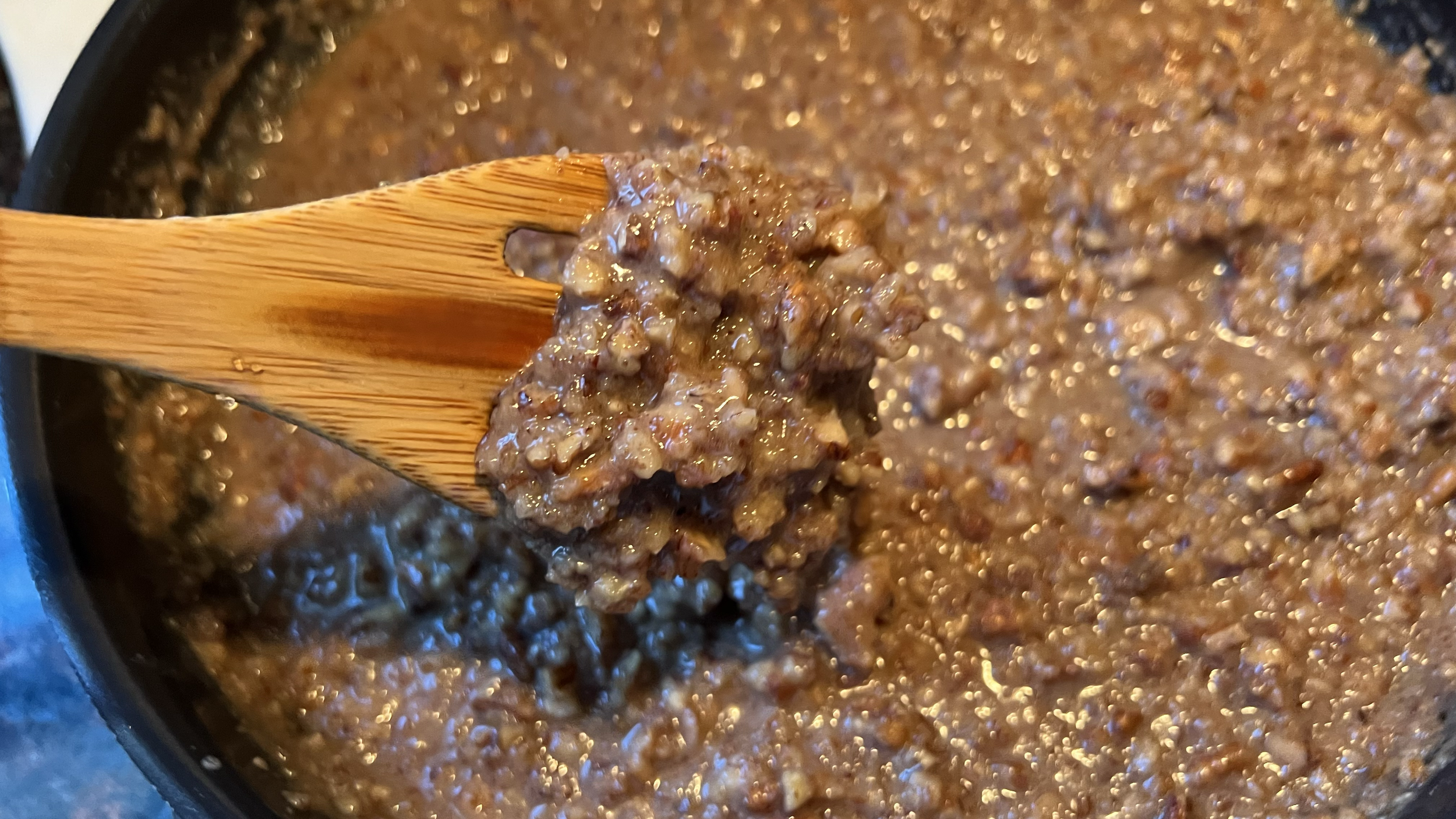 —As you stir, be on the lookout for small pieces of pecan shell that might bubble up.
