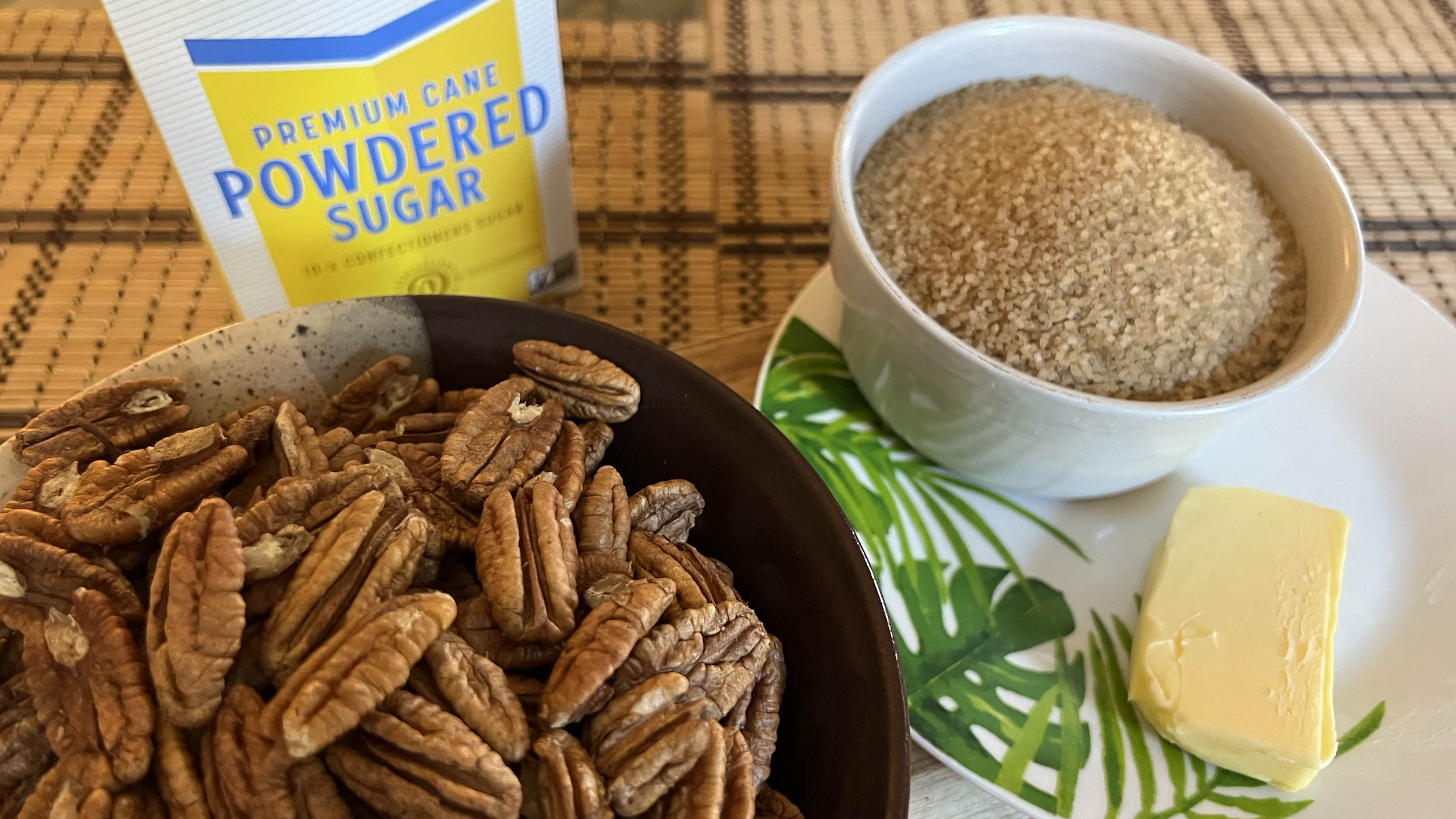 Fresh pecans, turbinado sugar, powdered sugar and butter