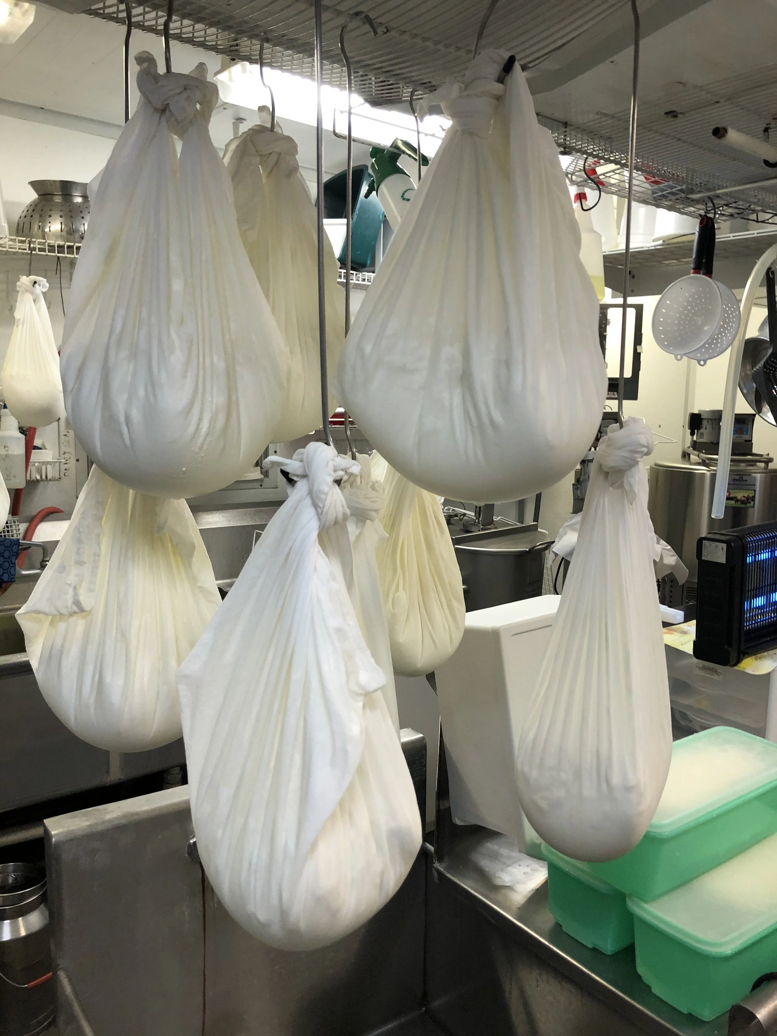 “Cheese is a living thing,” she said as we stepped into the heart of the operation—the room where milk is pasteurized, where fresh cheese curds hang in cheesecloth from the ceiling, and where she hand-blends her custom spices. I’d never thought of cheese that way before, but of course it made perfect sense. Cheesemaking, at its core, is about life—milk and microorganisms working in delicate harmony. And it all happens right here, all in one place, on this vibrant little micro-dairy—how refreshing is that?—in the shade of so many live oaks, surrounded by sounds of life in every direction: the cows, the goats, the people who tend and milk them. How could the cheese be anything but extraordinary?